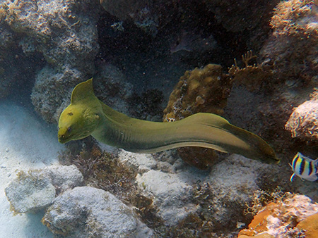 There are large coral heads in the center, swim throughs where moray eels like to hide, and lots of black wire coral on the overhangs.
