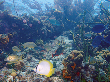 Immediately after the swim-through, you will see schools of large tarpon congregating along the coral wall as well as schools of jacks and snapper.